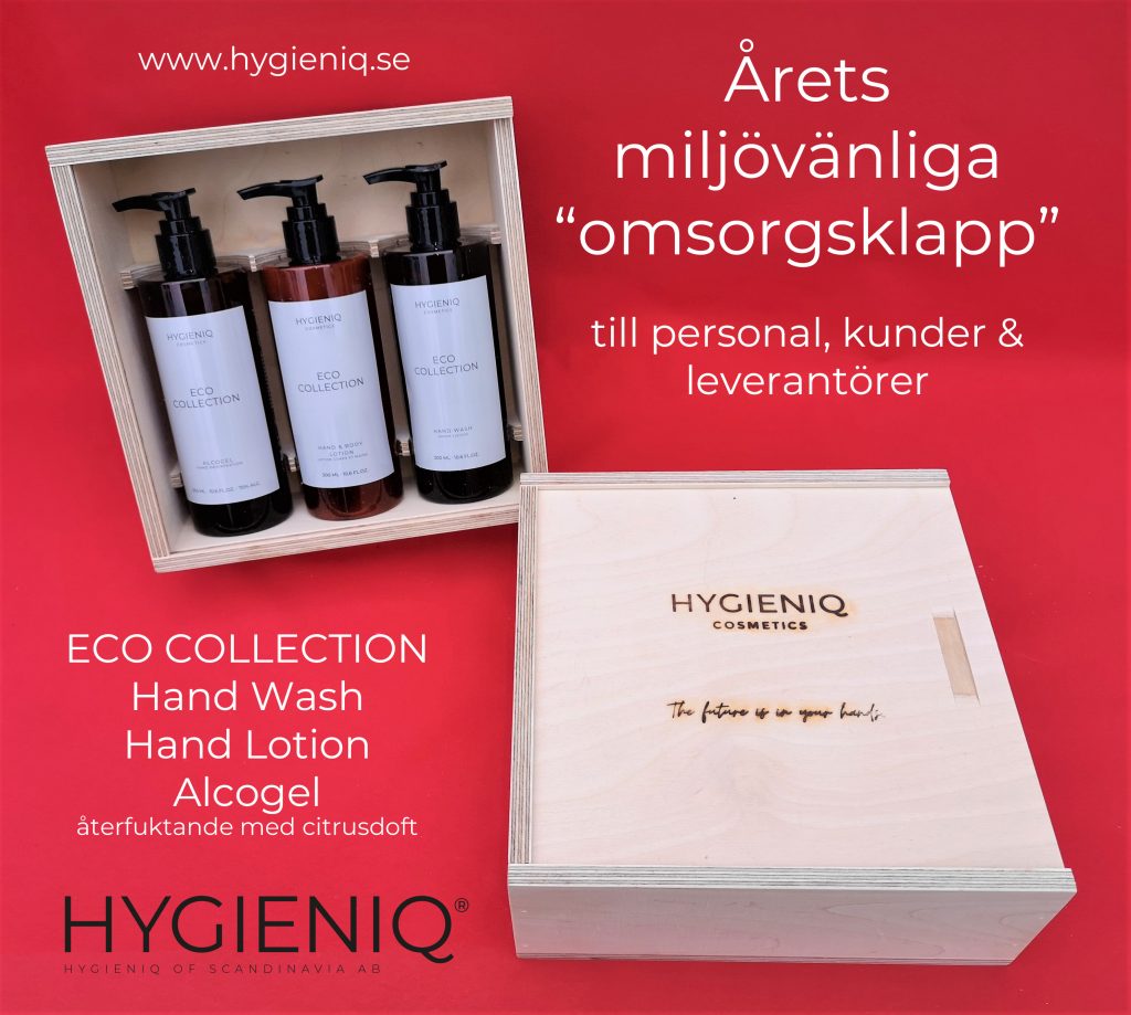 Den miljövänliga presentboxen, i obehandlad björkfanér med brännmärkt logo Hygieniq Cosmetics samt “The future is in your hands”, innehåller 3 st 300 ml pumpflaskor från vår väldoftande ECO collection serie.