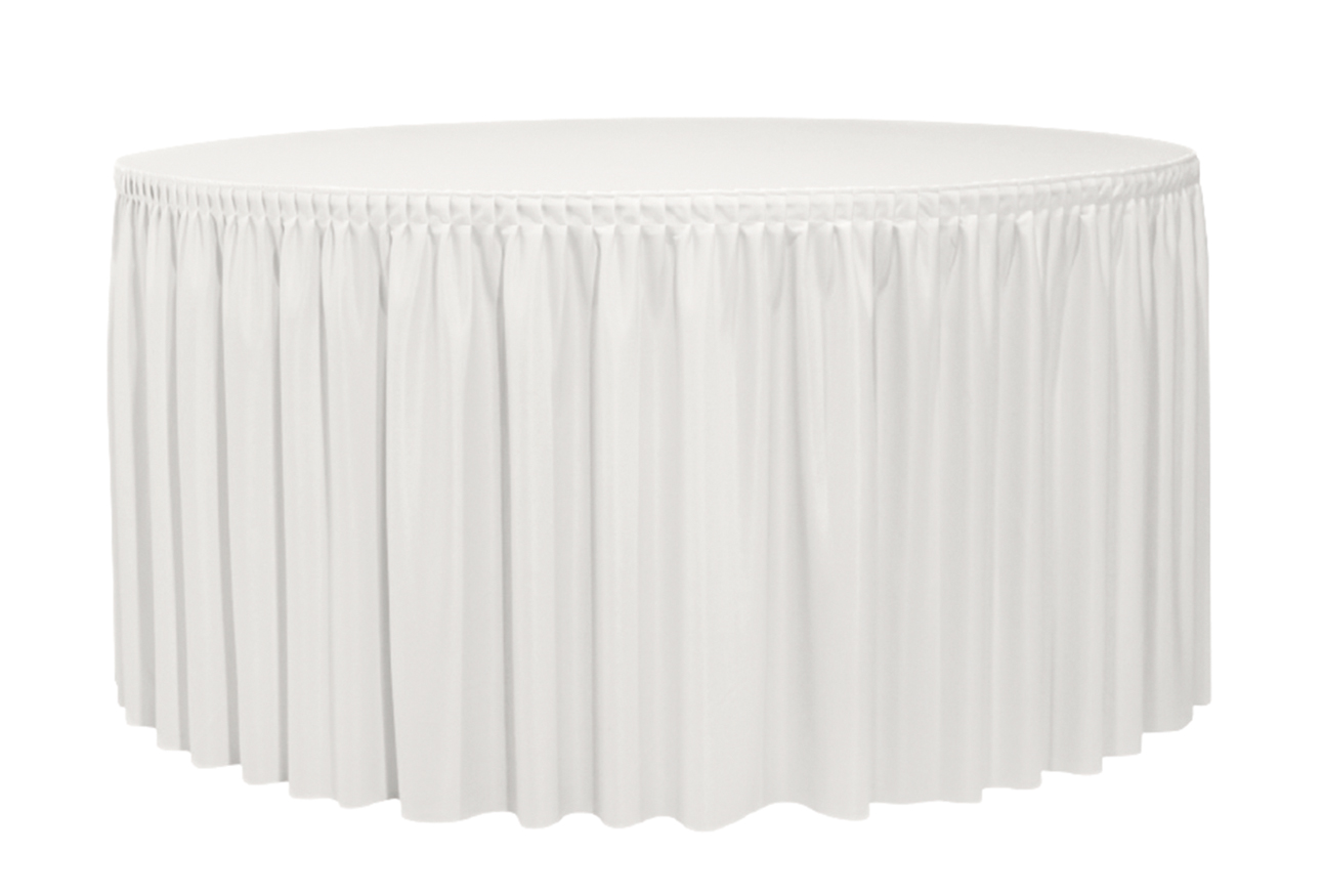 Färdigsydd Plisserad 180% Bordskjol. Färg vit, Tygkvalitet: Heavy Jersey